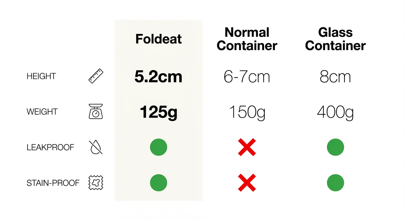 Slim, stackable design. Full meal capacity. Takes half the space. Finally fits in your bag without taking over.